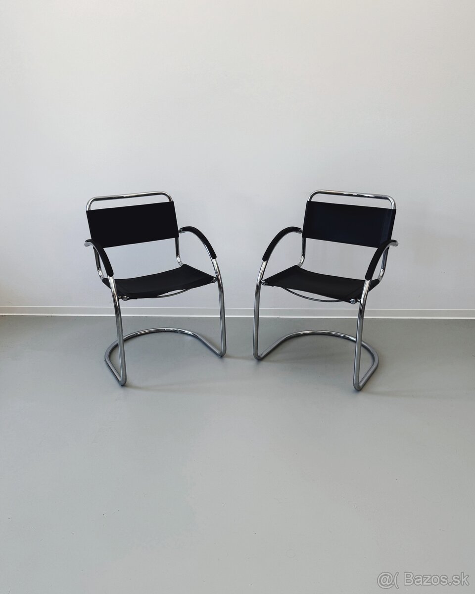Funkcionalistické stoličky zo 70tych rokov, chróm + koža. Používané - majú pár známok opotrebovania, ale nič vážne - môžete ich vidieť na posledných 3 fotkách. Na spodnej časti podsedáku majú ražbu Made in Italy. Cena za kus je 190€. Osobný odber.