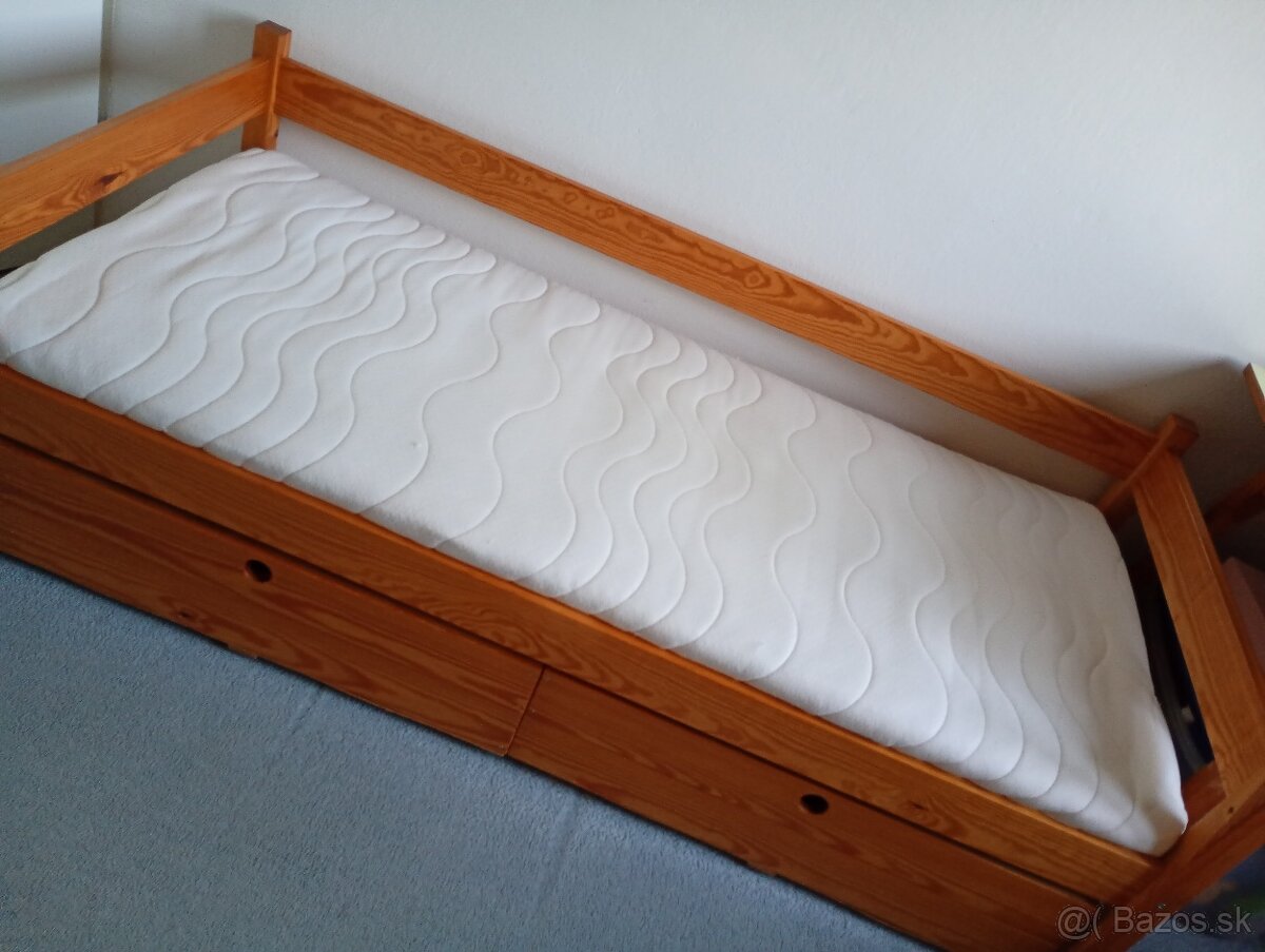 Predám detskú posteľ aj so zábranou.Spodne zásuvky na kolieskach.Využívaná minimálne.Matrac čistý,nepreležany.