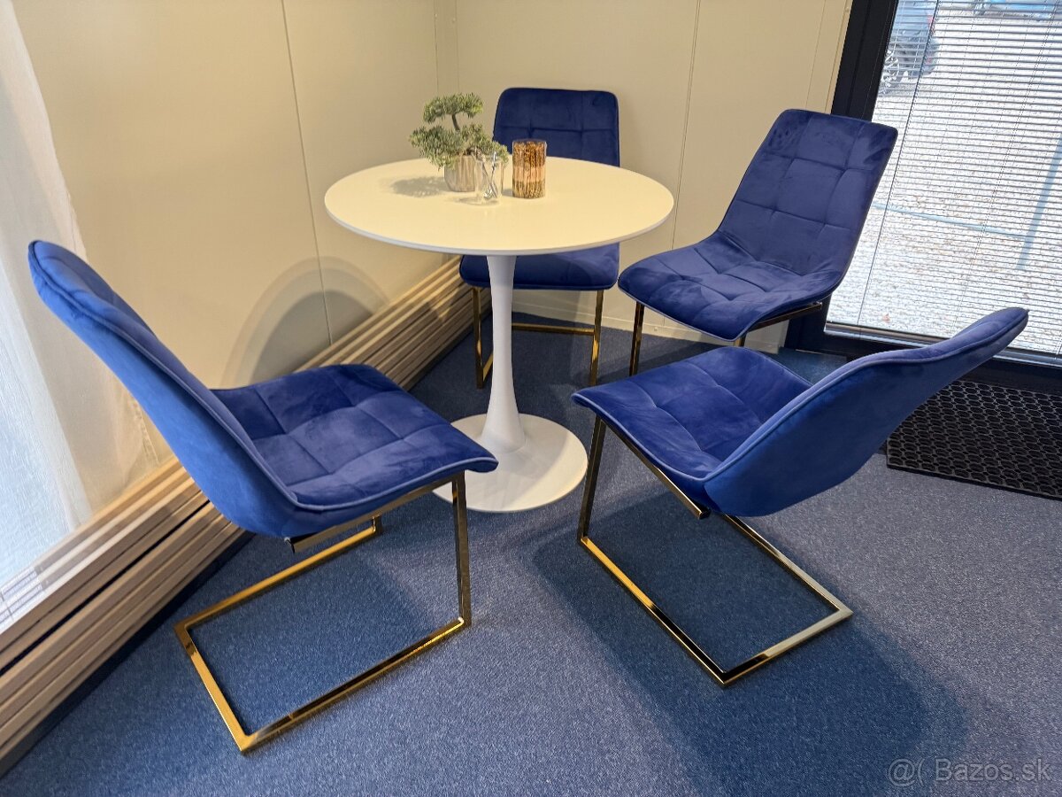Predam 4 stolicky modre, zo zlatou nohou a stol, priemer 80cm
