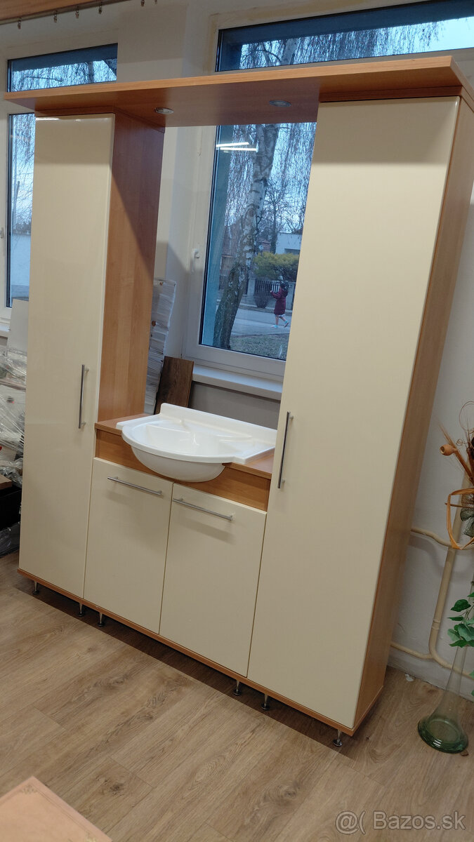 Predám kúpeľňové skrinky. Vystavený, nepoužívaný kus. Korpusy Lamino hruška poľná. Dvere striekané RAL vanilka.2 x vnútorná zásuvka. V hornej rampe 2 x bodové svetlo -halogen. Nožičky chrom. Výška 214 cm, širka 166 cm, hĺbka 31 cm s dvierkami. Plastové umývadlo je vpredu odreté.