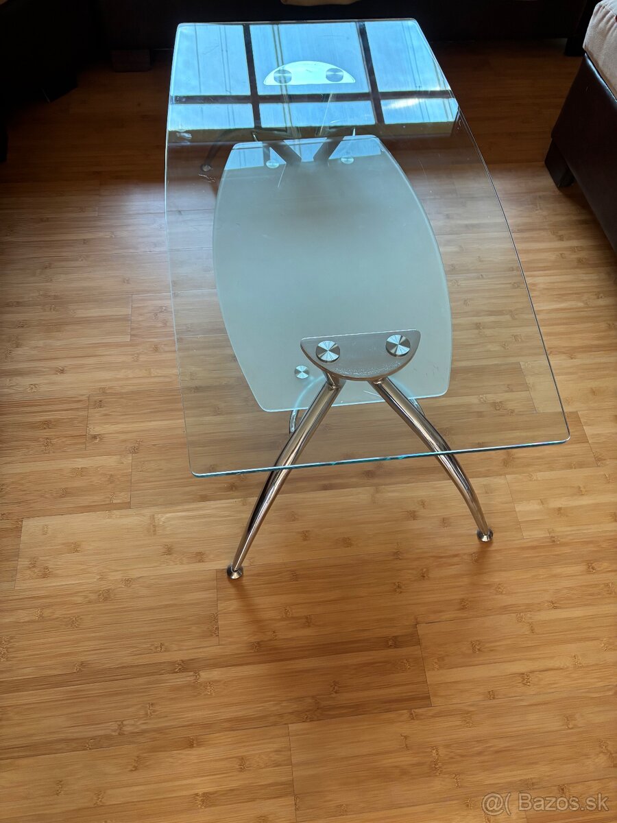 Skleneny konferencny stolik - [28.1. 2026]Stolík podopierajú oceľové nohy. Taktiež ho dopĺňajú sklenené pláty. Vrchné sklo je číre a spodné dve sú mliečne.