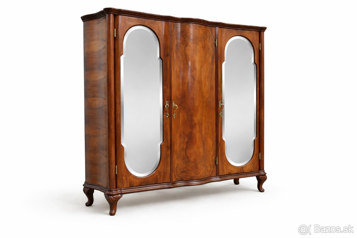 Predstavujeme elegantnú, päťdverovú šatníkovú skriňu z orechového dreva v neorokokovom štýle. Nábytok bol vyrobený v 50./60. rokoch 20. storočia.