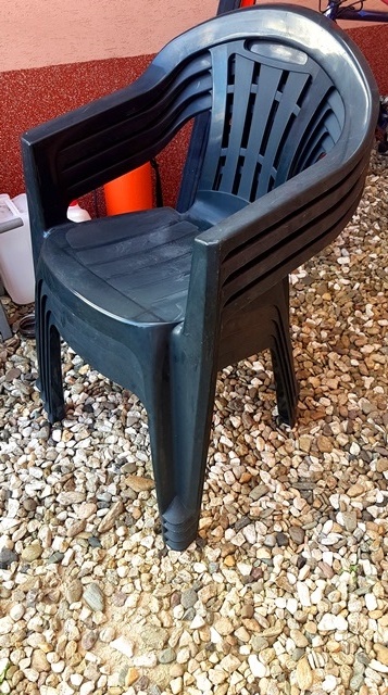 Záhradné stohovateľné kreslá tmavozelenej farby 4ks po 6 eur.