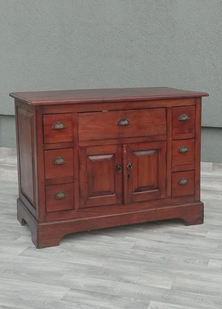 Vstúpte do sveta, kde sa tradícia spája s modernou eleganciou, a nechajte sa očariť touto teakovou komodou . Má 6 zásuviek , v spodnej časti s úložným priestorom , nad ktorým je vyklápacia doska, ktorá odhalí ďalší priestor. Stane sa kúskom, ktorý bude korunou vašej jedálne. Používaná . Výška – 75 cm , šírka – 101 cm , hĺbka – 50 cm .Dovoz Holandsko. Dovoz až k Vám domov viem v rámci Slovenska zabezpečiť po dohovore zadarmo . Pozrite všetky moje inzeráty možno zaujme aj niečo iné. Uprednostňujem telefonický kontakt pred sms a emailmi. Všetko je o dohode .