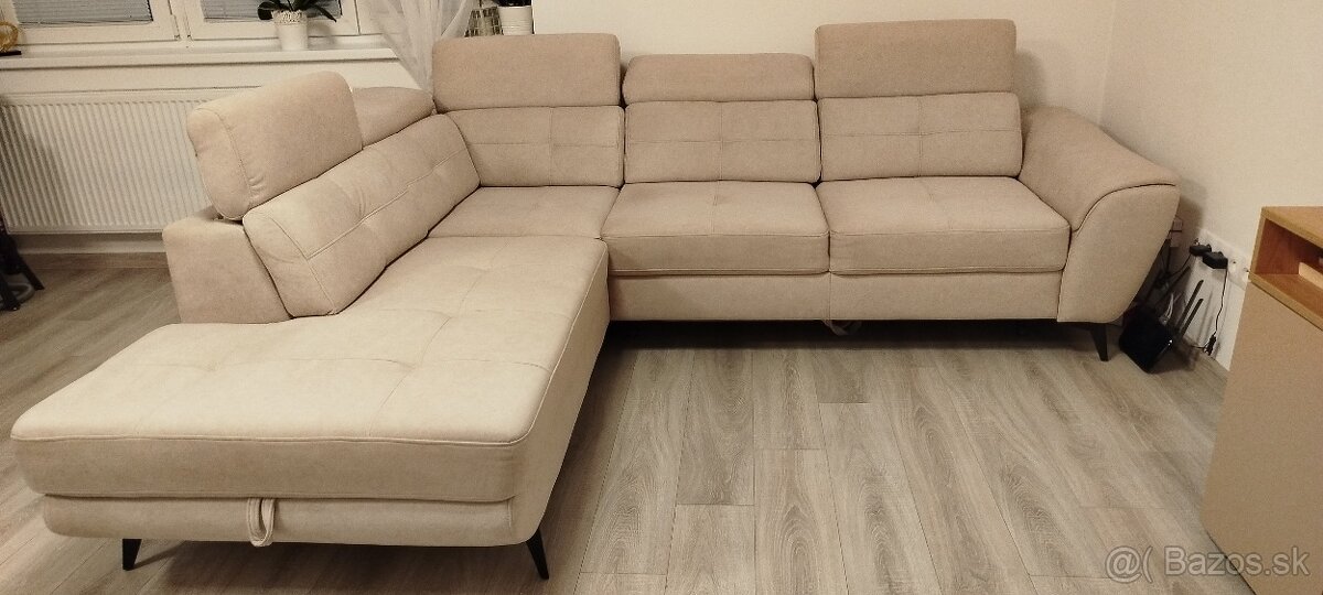 Predám kvalitnú rohovu sedačku.Bezovej farbe.Polohovatelne podhlavniky.Rozkladacia s úložným priestorom.Vo výbornom.(Používaná 1rok). Rozmery 2.70cm krát 2.25cm.Cena 970 eur.