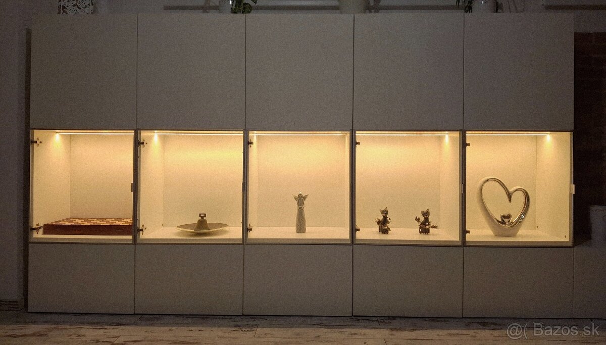 Obývacia stena s osvetlením značky Ikea, biela lesklá s rozmermi 300x40x167 cm.