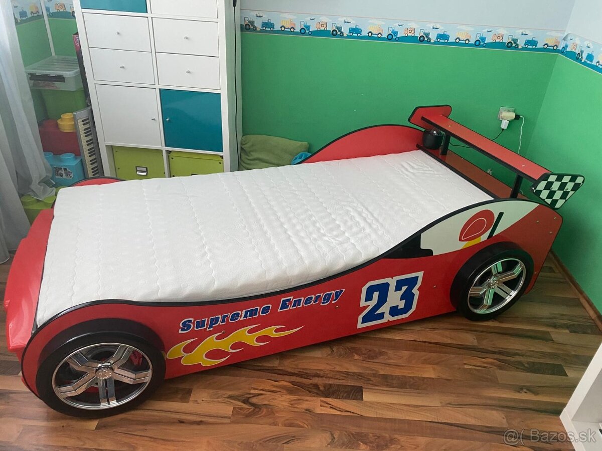 Predám zachovalú detskú posteľ v podobe pretekárskeho auta po jednom dieťati. Predná maska obsahuje LED osvetlenie, ktoré vytvorí skvelý efekt počas večera. Farebné polepy na bočných stranách a optika športových kolies dotvára športový vzhľad pretekárskeho auta. Zadný spojler poslúži ako polička napríklad na odkladanie knižiek alebo hračiek. Plocha lôžka je 90×200 cm, posteľ sa predáva spolu s lamelovým roštom bez matraca. Pri rýchlom jednaní možná zľava.