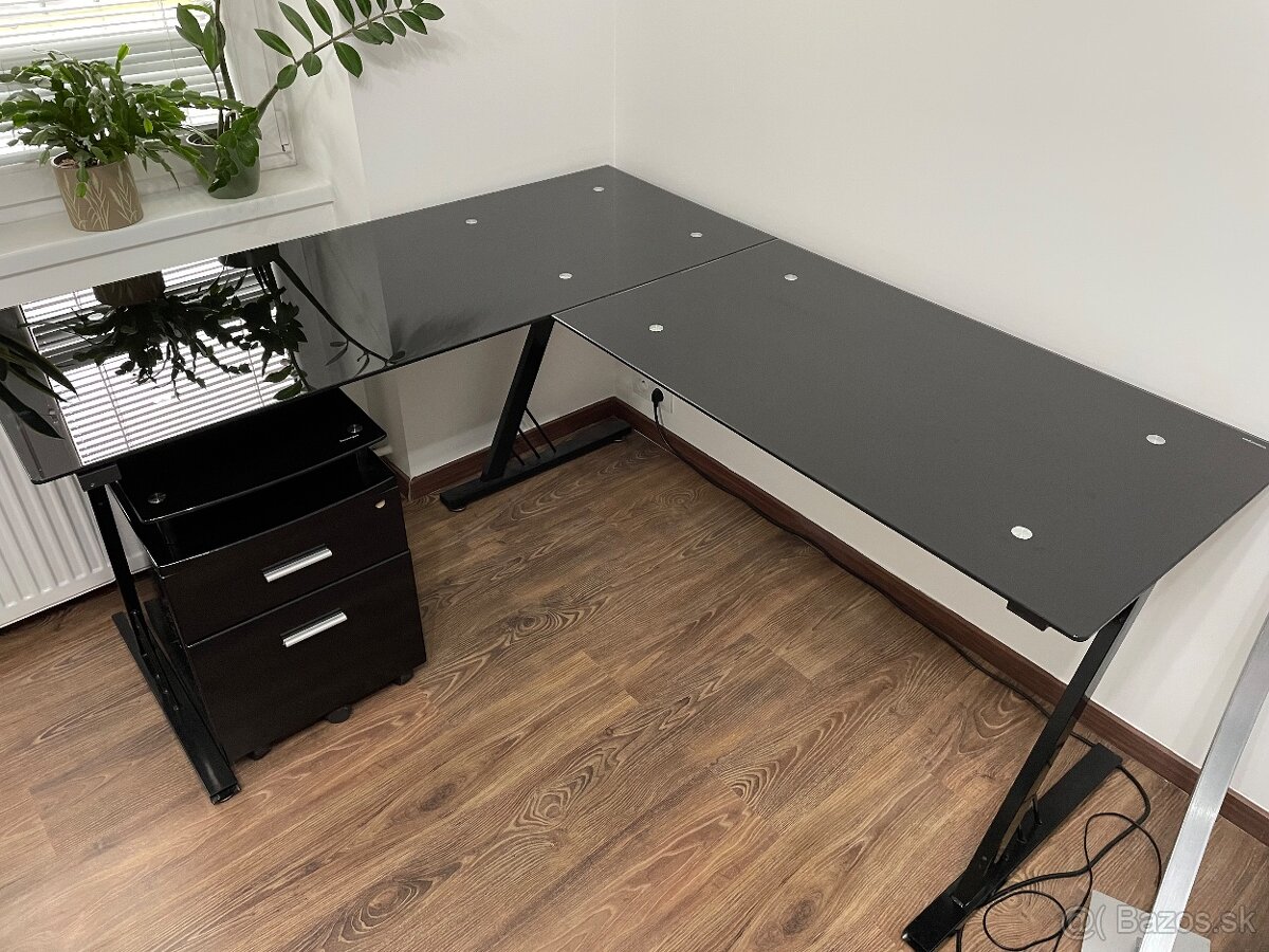Predám sklenený rohový pracovný stôl v čiernej farbe so zásuvkovým kontajnerom, obe veľmi málo používané bez evidentných poškodení, plne funkčné