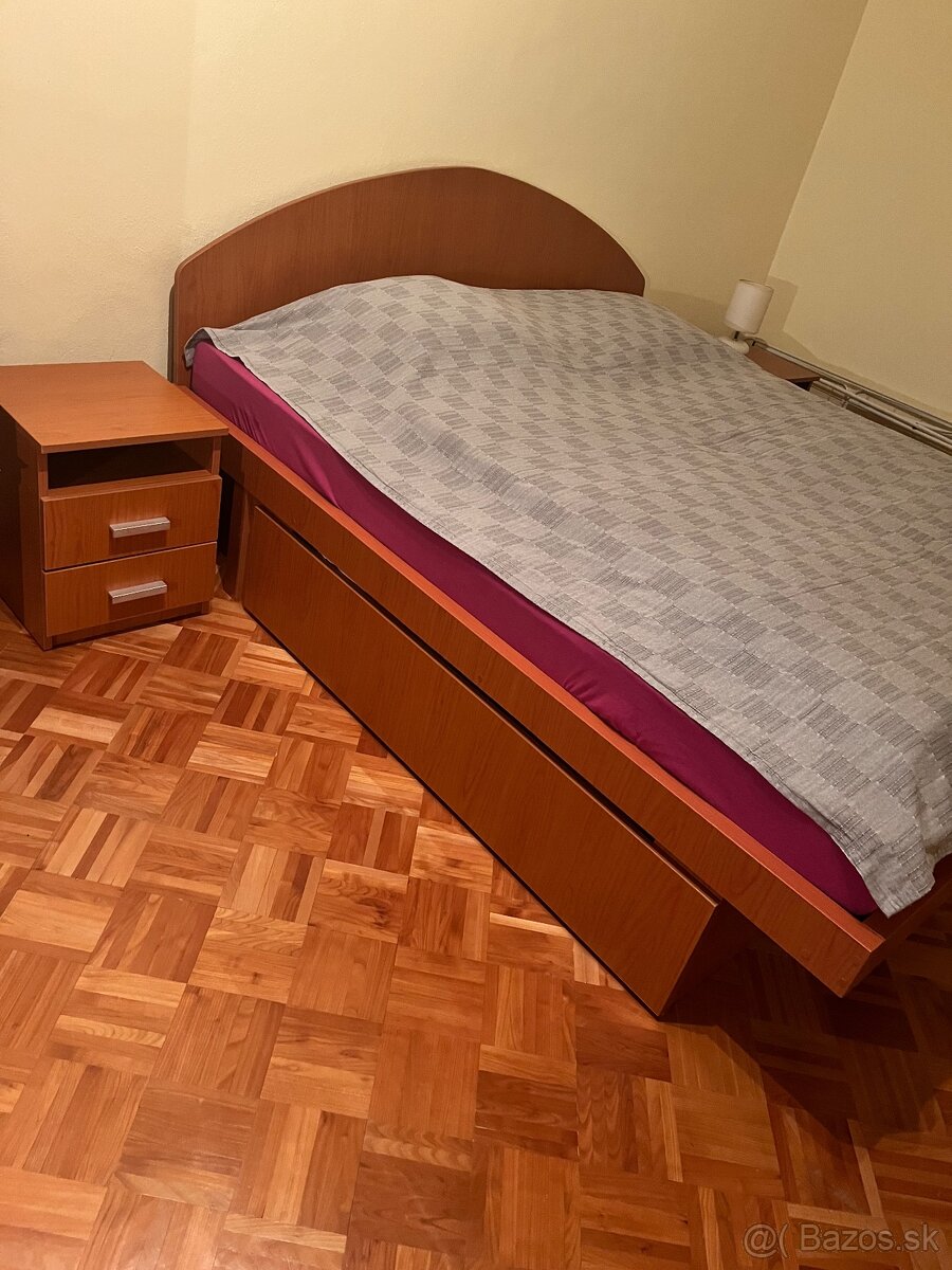 Predám masívnu drevenú manželskú posteľ odtieň drevo čerešňa. Úložné priestory na oboch stranách, nočné stolíky 2 ks , nočné lampy 2 ks, madrace kvalitne pružinové 2 ks. Možnosť kúpy aj bez madracov.