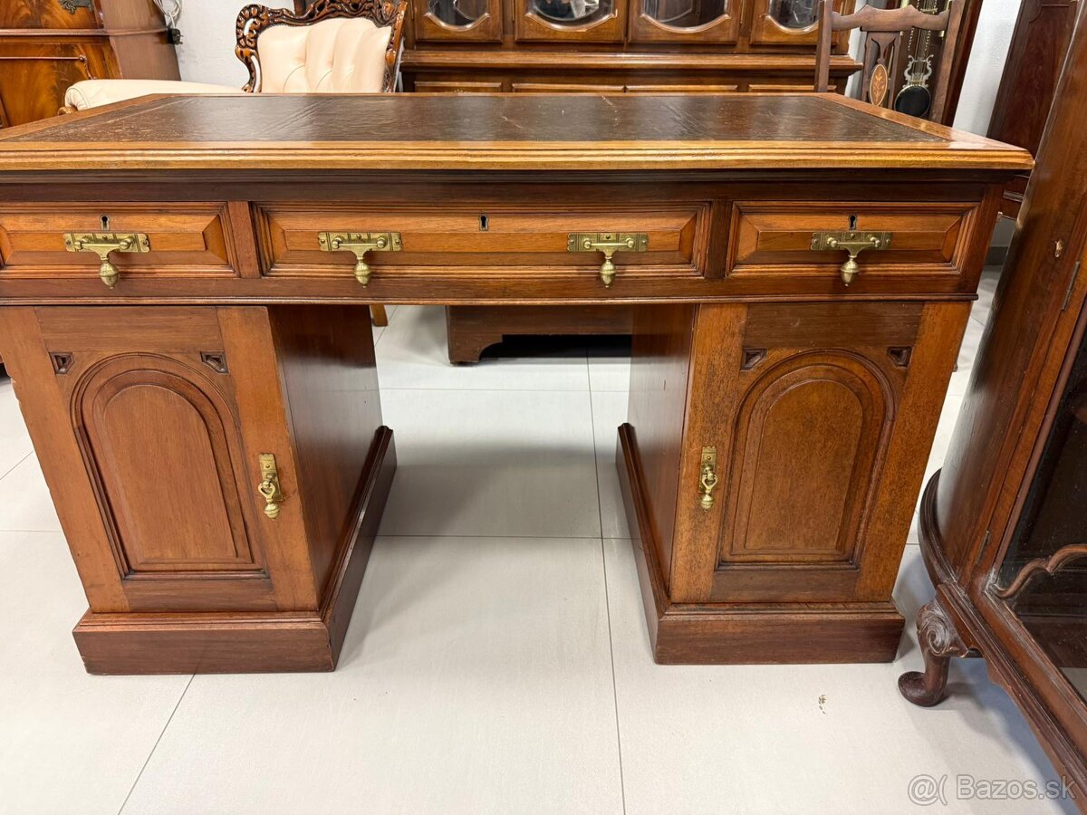 🪶✨ Tento nádherný antický písací stôl je kus histórie, ktorý prežil celé generácie. Jeho pôvodná kožená doska s patinou rozpráva príbehy listov, podpisov a myšlienok z čias, keď sa písalo perom a atramentom. Masívne drevo, mosadzné kovanie a praktické skrinky mu dodávajú eleganciu, ktorú dnešný nábytok len ťažko napodobní.