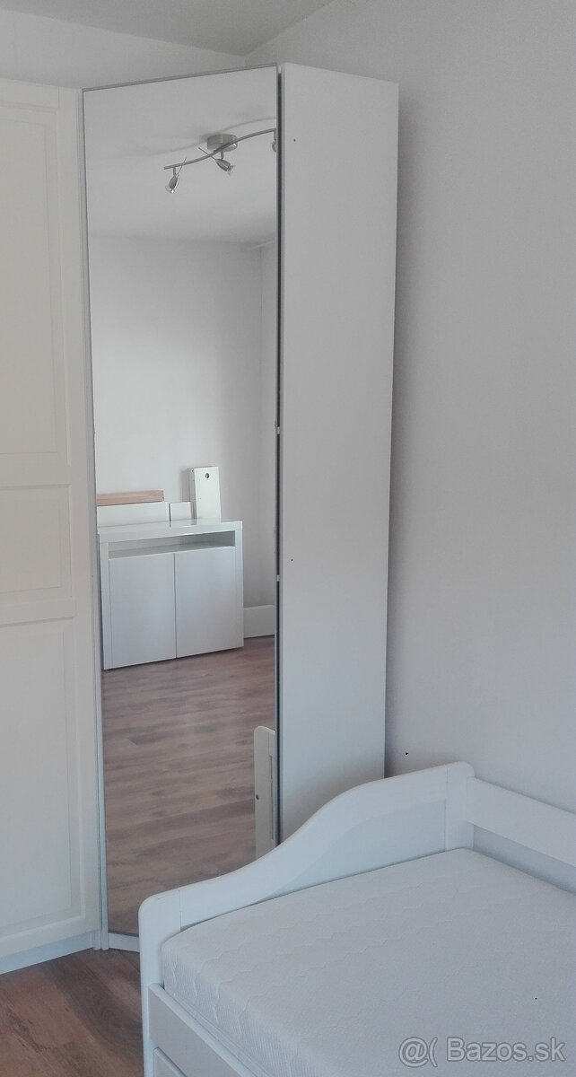 Predám bielu rohovú skriňu ikea Pax so zrkadlovými dverami. Rozmer 73x73x236,5 cm. Dvere možno povesiť na pravú alebo na ľavú stranu. Vnútorné vybavenie - 2 police a 2 tyče na vešanie - možnosť ľubovoľného umiestnenia. Zachovalá, bežné známky používania. Cena 199 €