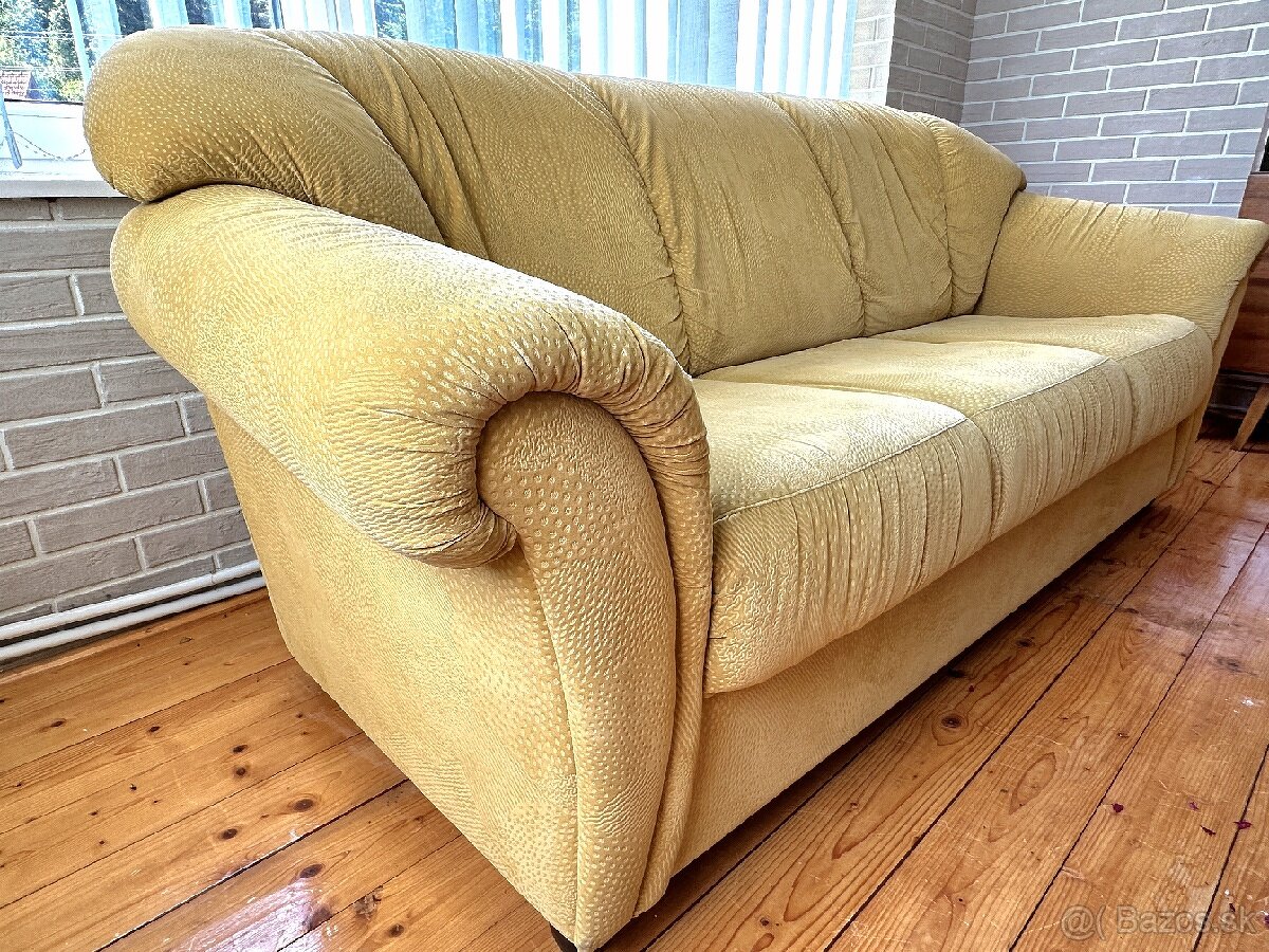 Sedacia súprava - trojmiestny gauč a kreslo značky MSJ, žltá pastelová farba ,vo vynikajúcom stave - nie je vysedený ani vyblednutý. Nie je rozkladací. Látka imitujúca brúsenú kožu. Predaj len spolu. Doprava v réžii kupujúceho. Cena je pevná. Nachádza sa v Smižanoch.