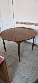 Predám - jedálenský stôl + 6ks čalunená stolička. Kruhový stôl priemeru 117cm sa dá rozložiť na oválny. Kvalita - tradičná výroba z masívneho dreva (vid foto).