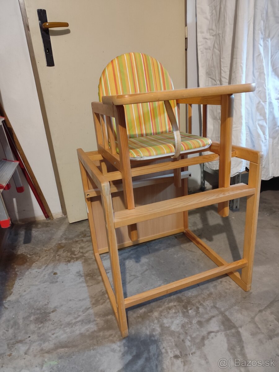 Predám zachovalú detskú drevenú stoličku na kŕmenie. Po rozložení slúži ako stolík so stoličkou na jedenie, hranie, kreslenie a pod. Nová je v súčasnosti v predaji za 70-75€.