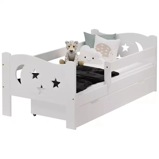 Posteľ bola veľmi málo používaná. Má nejaké kozmetické chybičky, ale nic strašné. Má dva praktické úložné boxy a zábranu, ktorá je prasknutá, ale stále drží, je odnímateľná.