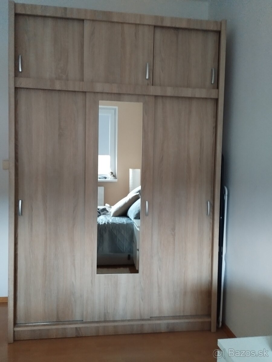 Skriňa trojdverová so zrkadlom - [26.1. 2026]Skriňa sa skladá z troch častí. 1. časť 5 polícová, druhé dve su polica a vešiaková tyč. povrch svetlá dýha, roll door systém. rozmery