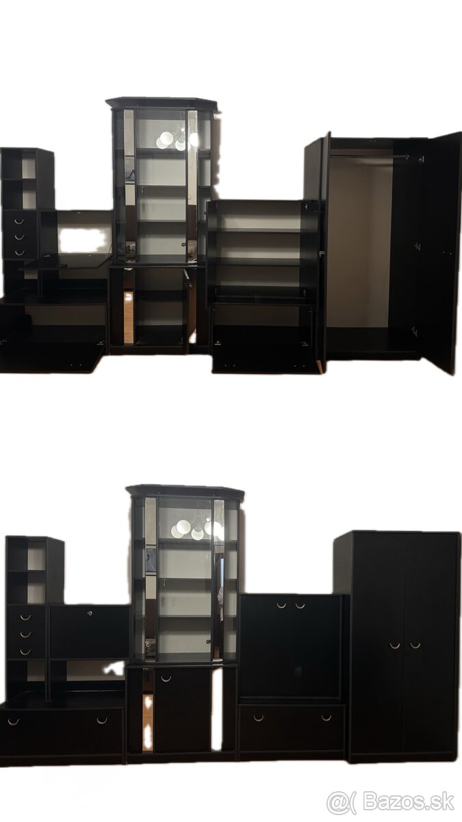 Predám obývaciu stenu / nábytkovú zostavu v čiernej farbe (lesklý/matný mix) so sklenenou vitrínou. Zostava je praktická a ponúka veľa úložného priestoru – police, zásuvky aj uzatvárateľné skrinky. Súčasťou je aj vysoká skriňa s dverami (vhodná na oblečenie alebo veľké veci) a presklená vitrína na dekorácie/sklo. Nábytok je pevný, stabilný, vhodný do obývačky alebo pracovne.