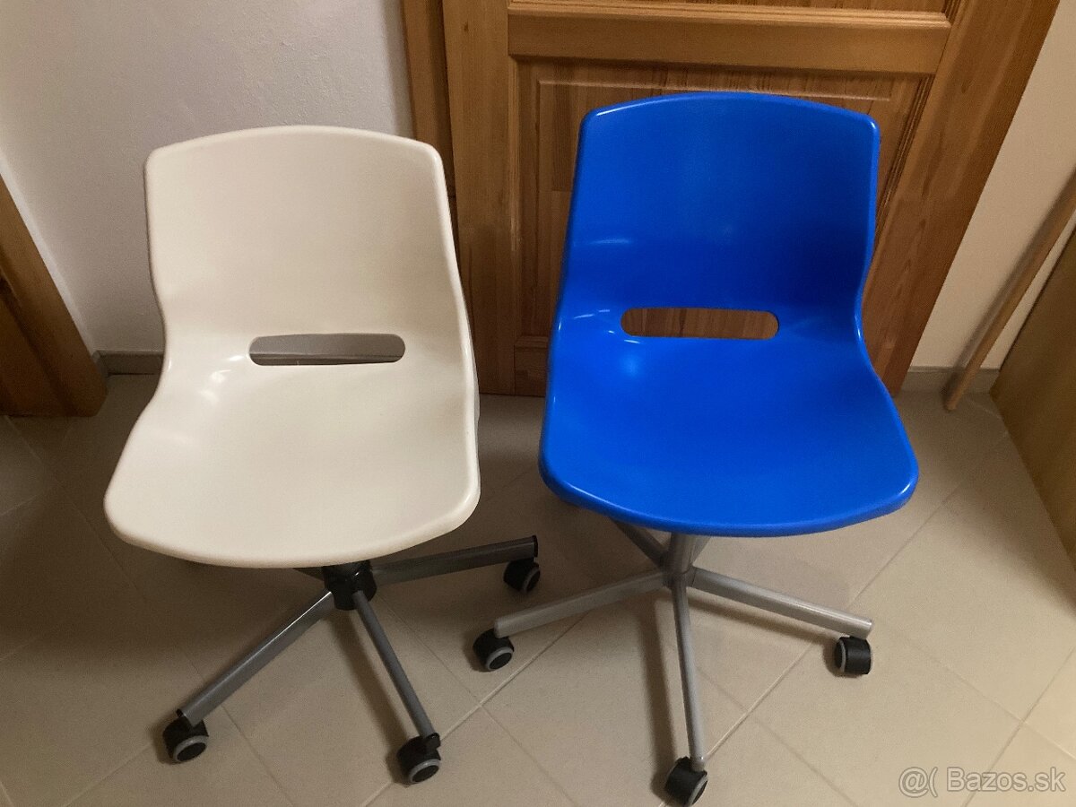 Predám otočnú, kancelársku, kolieskovu stoličku. Plastová modra a biela farba. Kolieska su pogumované, určené na tvrdú podlahu. Stoličky majú známky používania ale su funkčne. Cena 10€/ kus