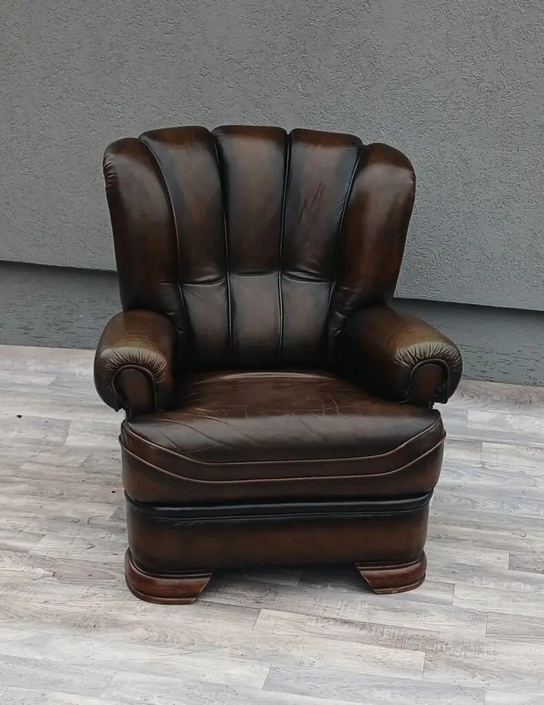 Toto hnedé kožené kreslo je dizajnový kúsok, ktorý sa často označuje ako kreslo v štýle Chesterfield , alebo Art Deco, prípadne ako ušiak . Má výrazný nadčasový dizajn. Zakrivené, lastúrovité operadlo , zaoblené tvary , masívny drevený rám a pevné drevené nohy, ktoré zaisťujú stabilitu. Je vyrobené z hrubej pravej kože v hnedom odtieni s nestarnúcou patinou . Vďaka širokému sedadlu, vysokému operadlu s „uškami“ a nadštandardne polstrovaným podrúčkam je navrhnuté pre maximálne pohodlie a podporu. Používané – v zadnej časti s menším poškodením viď. posledná fotografia. Výška – 98 cm , šírka – 85 cm , hĺbka – 85 cm , výška sedu – 42 cm , hĺbka sedenia – 55 cm .Dovoz Holandsko. Dovoz až k Vám domov viem v rámci Slovenska zabezpečiť po dohovore zadarmo . Pozrite všetky moje inzeráty možno zaujme aj niečo iné. Uprednostňujem telefonický kontakt pred sms a emailmi. Všetko je o dohode .