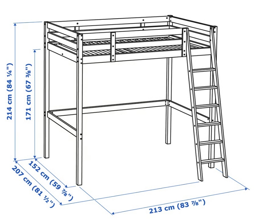 Je vysoká a široká, tak aby bol pod ňou priestorom pre stolík / detský kútik, alebo ďalší matrac. Funkčná, rozložená, pripravená na odvoz. Cena je aj s matracom.