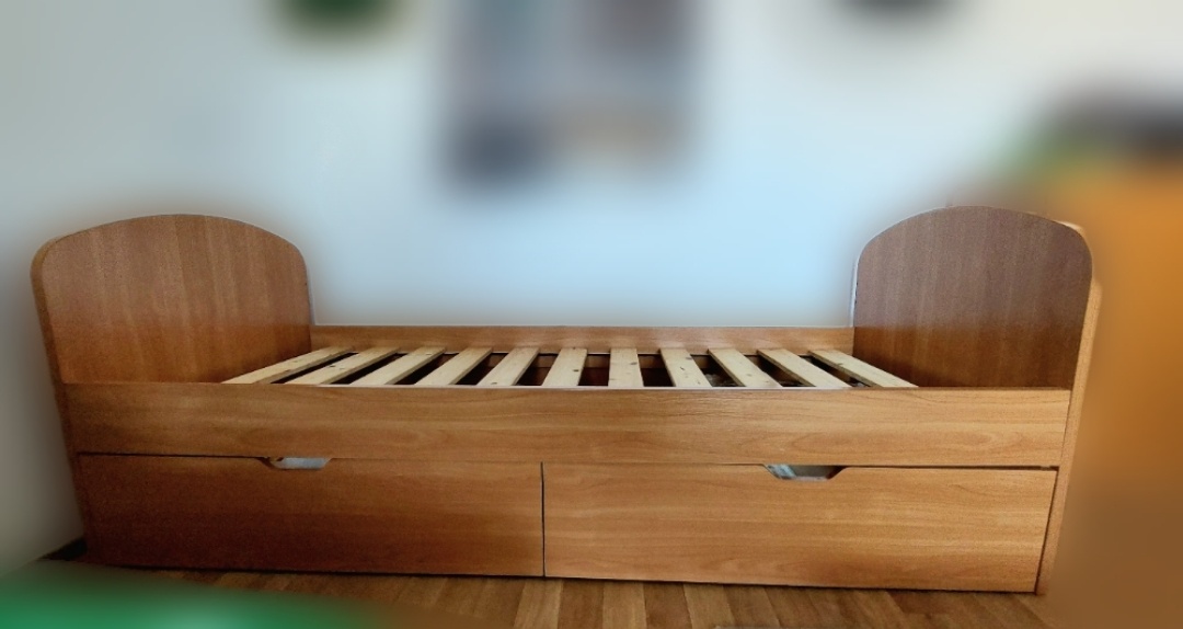Posteľ v demonte kôli priestorovým možnostiam. Zásuvky zmontované.