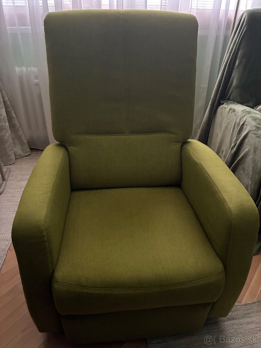 Predam polohovatelne kreslo s kvalitnym latkovym potahom zelenej farby bez zmamok pozivania. Kreslo ma kovovu konstrukciu a je na kolieskach pre lahky presun po podlahe. Opierka chrbta sa da sklopit az do lezatej polohy a je mozne na nom aj spat. Len osobny odber.