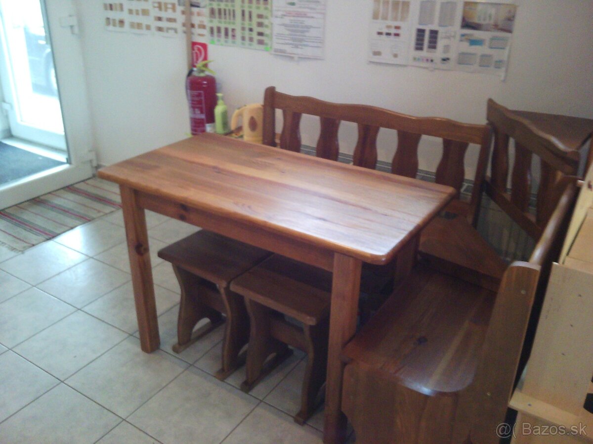Predám univerzálny a praktický kuchynský rohový komplet z borovicového masívu v morení dub s rohovou lavicou, stolom a dvoma taburetkami. Sedacia časť lavice je otváracia, slúži ako úložný priestor (hĺbka 24cm). Vyrobil som ho omylom naviac.