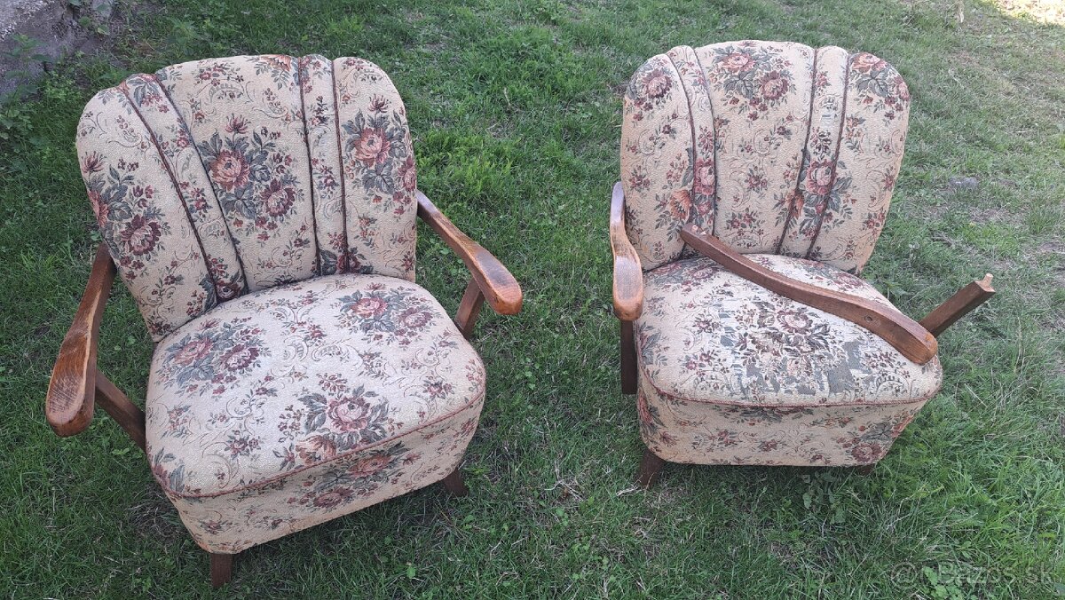 Retro kreslá - [21.2. 2026]Predám retro kreslá 2 ks v dobrom stave. Poťah je zachovalý, sedáky sú ale presedené, preto sú vhodné na renováciu. Drevené časti sú vzhľadom na svoj vek pekne zachovalé.