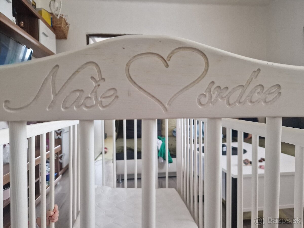Predám komplet detskú postieľku s príslušenstvom. Logo na posteli naše srdce. Príslušenstvo je paplón, vankúš, baldachyn, sieťka, organizer, matrac z aloe vera, postel je polohovatelna, dohoda možná