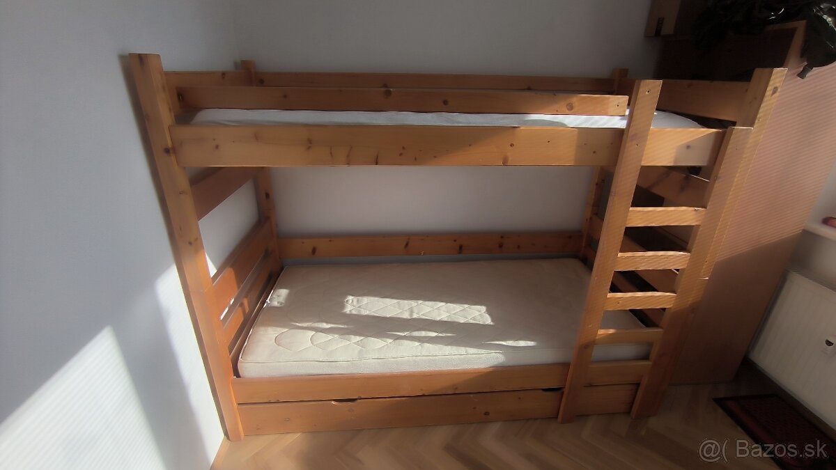 Ponukam na predaj poschodovu postel z masivu, matrace+ rosty, moznost postavit nad sebou alebo do L, su k tomu vsetky sucasti