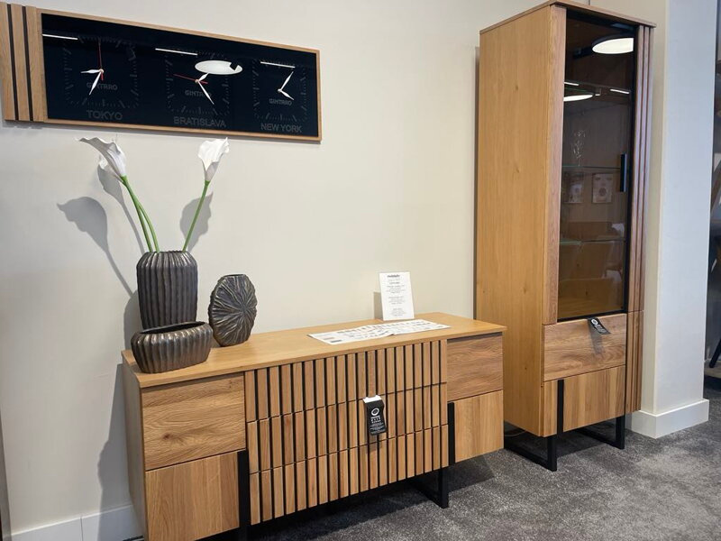 Zostava je v bezchybnom stave. Ide o výstavný kus v obchode nábytku. Farebné prevedenie: Dub natural lager.Korpus je z masívnej dubovej dýhy. Dvierká: dubové drevo. Nohy:kovové čierné