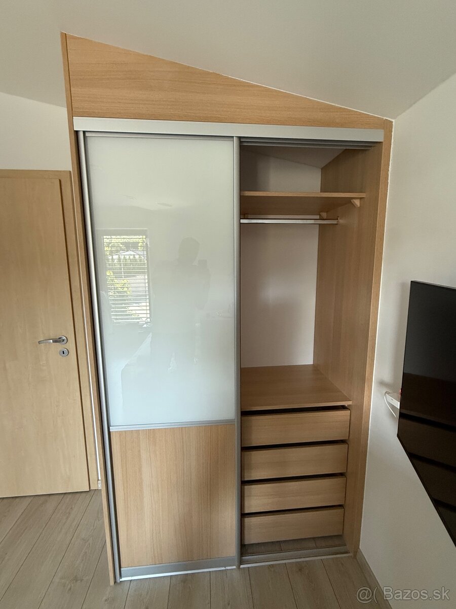 Predám vstavanú skriňu ako novú, rozmery: šírka 125, výška 205 v rovine, 231,5až po vrch šikmina, hĺbka 60, polička ľavá šírka 61, polička pravá široká 57, výška šuplíka 19 vpravo, výška poličiek 30 a 20 vľavo. Možnosť dovozu v rámci BA a okolia.