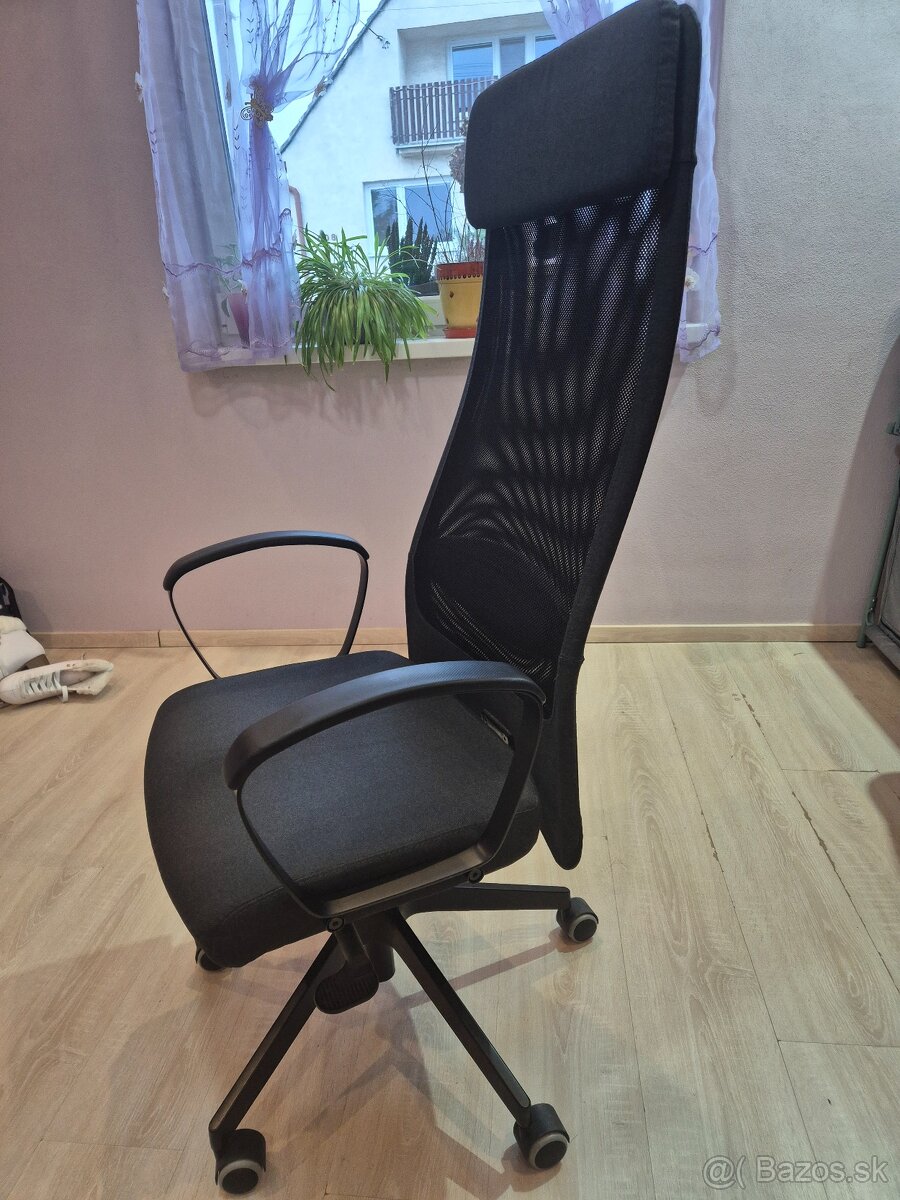 Predam ciernu kancelarsku stolicku, kupovanu v Jysku, povodna cena 130Eur. Ma vysoke operadlo, cize az nad hlavu, zarucuje pohodlne opretie vratane hlavy, je tam taky vankusik. Ma nastavitelny sklon operadla, pomocou packy zospodu a nastavitelnu vysku sedaku. Sedak je textilny a opierka sietovana kvoli priedusnosti. Podrucky su fixne, su tvarovane, vyvysene, potiahnute kozenkou kvoli pohodliu pri opierani.Na kolieskach. V dobrom stave. Cena fixna (viac menej symbolicka, kedze to nie je ani tretina povodnej). Mame ju v Kutoch, okres Senica. Osobny odber.