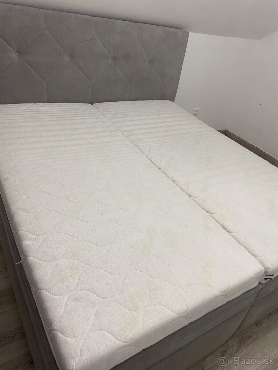 Predám rok starú manželskú čalúnenú posteľ. Rozmery postele 180x200cm. Posteľ sa dá polohovať, má úložný priestor. K tomu pridávam dva ortopedické matrace 90x200cm. Posteľ je vo veľmi dobrom stave, má dve nedokonalosti viď na foto (menšia dierka v úložnom priestore a trochu nadlomený rošt) v používaní to však nebráni. Mám k nej aj bloček. Pôvodná cena postele a matracov spolu bola 1037€