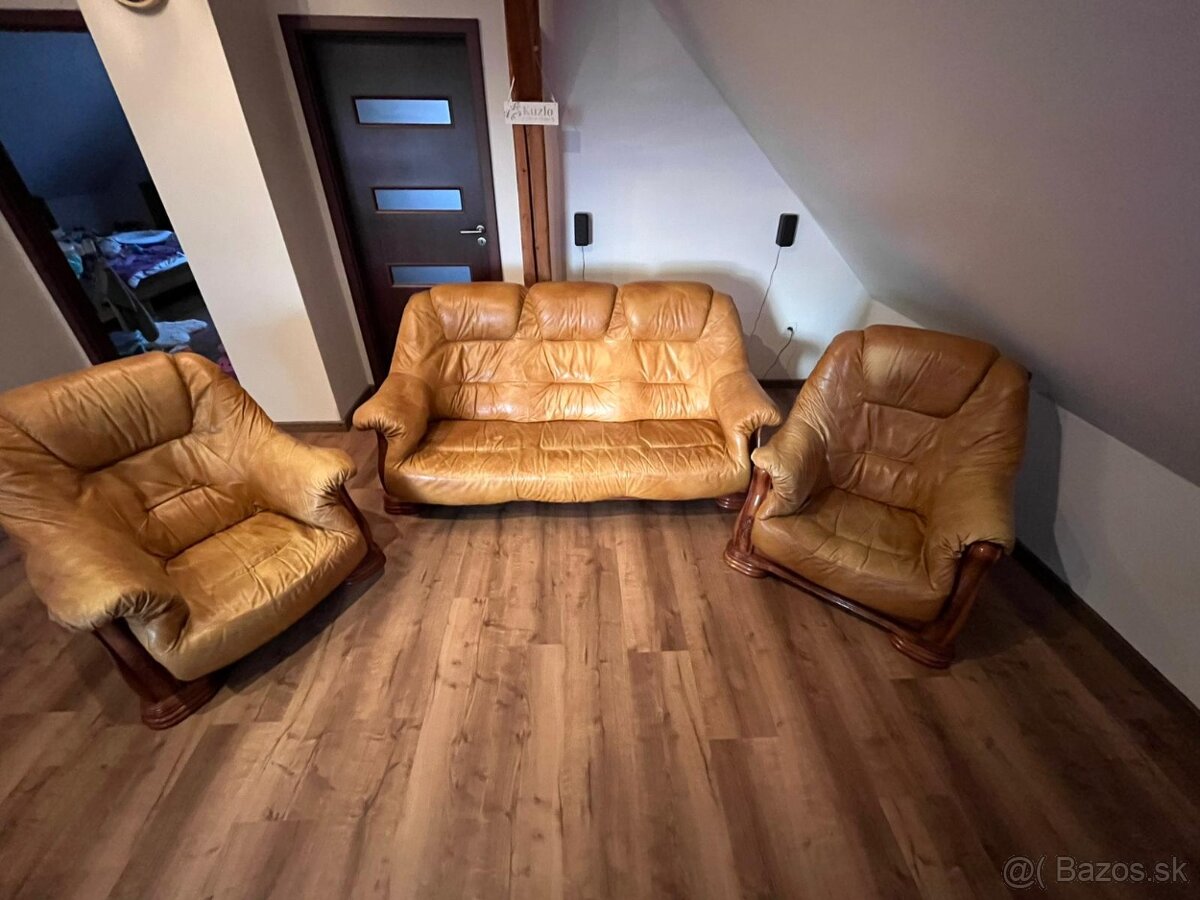 Kožená sedacia súprava (trojsedačka) s masivnym drevom - [2.3. 2026]Predám koženú trojsedačku s masívnym dubovým drevom.