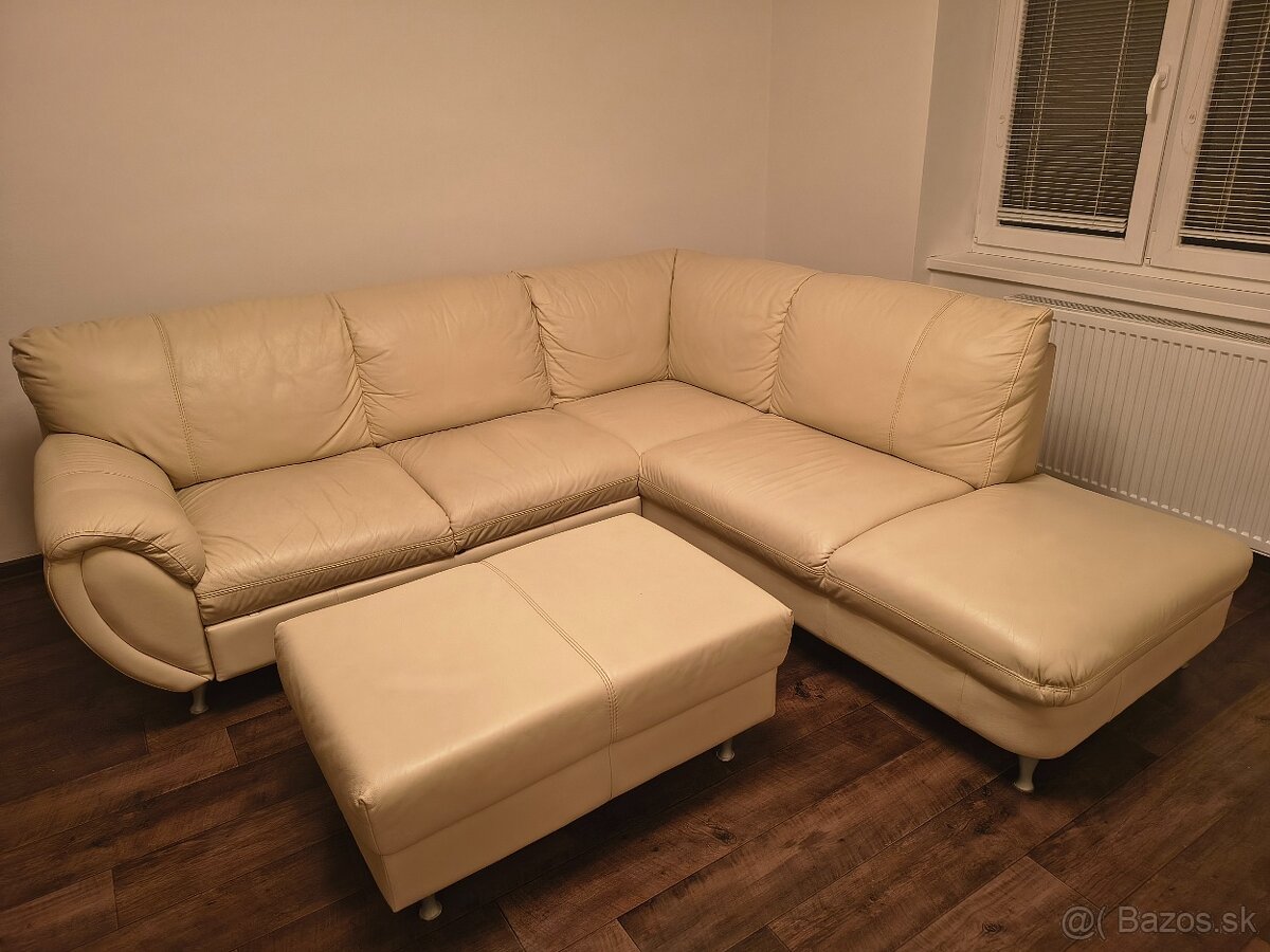 Kožený rozkladací gauč s taburetkou