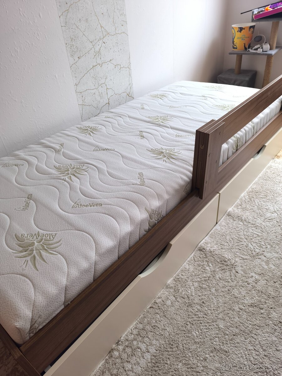Detska postel 160 cm - [9.2. 2026]Predam detskú posteľ so zabranou z masívneho borovicového dreva 160x80cm. Pod postelou je vysúvací šuflík s úložným priestorom viď foto. K posteli je matrac s kokosovym vlaknom, nepremokavá podložka a 2 kusy plachiet. Postel je vo velmi dobrom stave.
