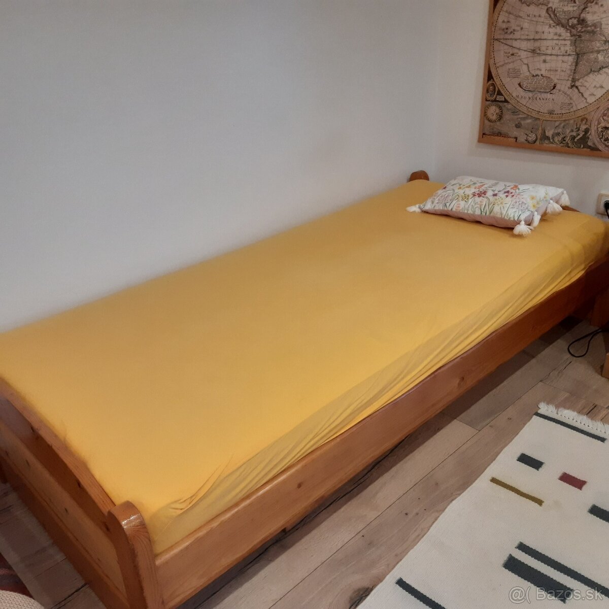 posteľ z dreva, rošt, úložný priestor - šuflík na kolieskach (všetko masív). Bez matraca.
