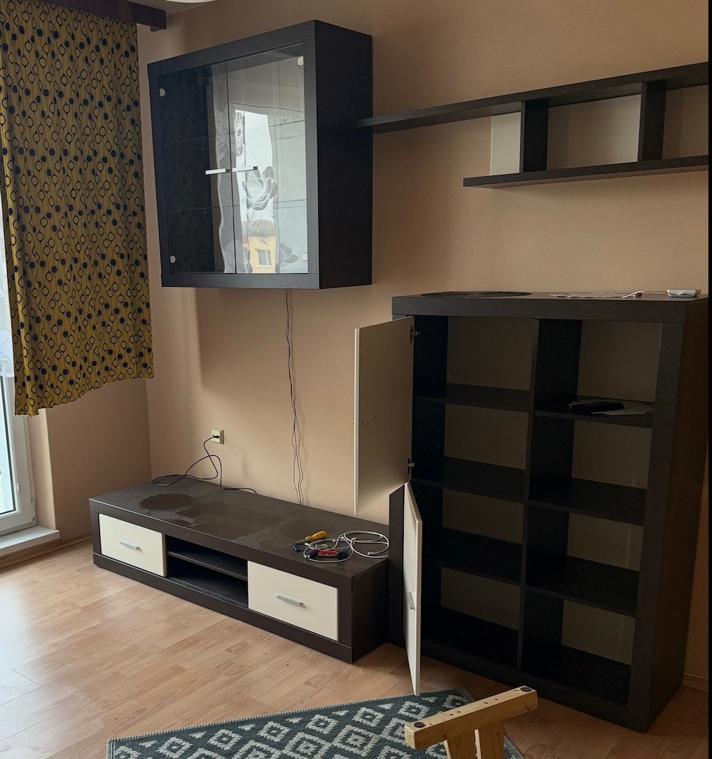Predám peknú obývaciu stenu v dobrom stave ako nova, v prevedení biely lesk/dub. Stena sa skladá z TV skrinky + závesnej nástennej poličky, vysokej skrinky a nižšej presklenej skrinky, ktorá je aj podsvietena. Nutný osobný odber