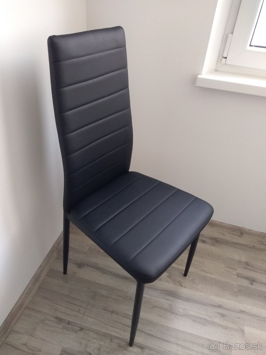 Predám set 4ks jedálenských stoličiek. Stoličky sú pohodlné, majú čierny koženkový poťah a kovové nohy.