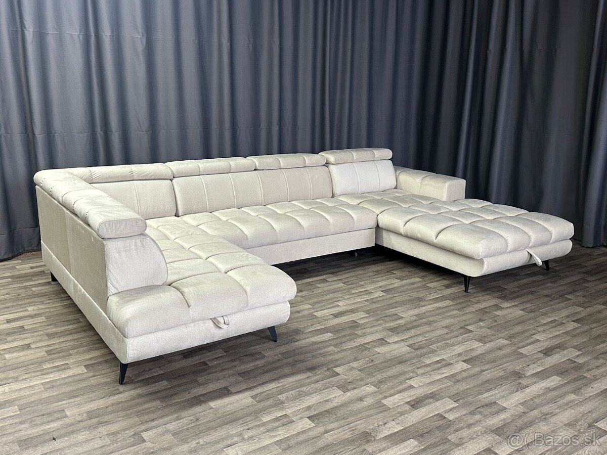 Predám krásnu sedaciu súpravu. Ide o výstavný a nepoužívaný kus. Sedačka je v tvare U, je rozkladacia s dvoma odkladacími priestormi a má tiež polohovateľné opierky hlavy. Sedačka ma krásne dizajnové prešívanie.
