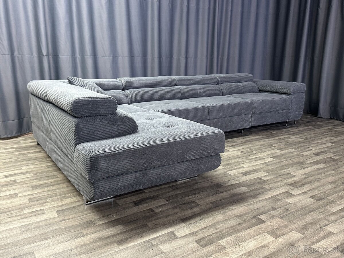 Predám moderný rohový gauč L-ko. Ide o výstavný kus. Rohová sedačka je rozkladacia, má jeden veľký odkladací priestor a má aj polohovateľné opierky hlavy. Pohovka má tvar L.
