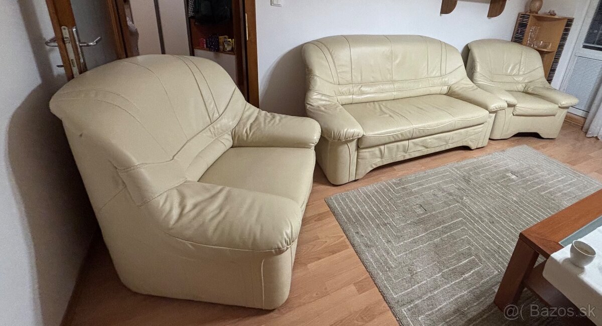 Ponúkam na predaj koženú súpravu. Jedna sa o gauč a dve kresla. Gaučová súprava je v super stave, kvalitne prevedenie. Krémová farba. Jediná chybička je na jednom kresle na jednom mieste je mierne ošúchanie. Druhe kreslo ako gauč sú v poriadku. Predavame kvôli prerábke obývacej izby, môže ešte výborne poslúžit ďalej doma či na chate. Cena 500€ pri rýchlom jednaní dohoda mozna.