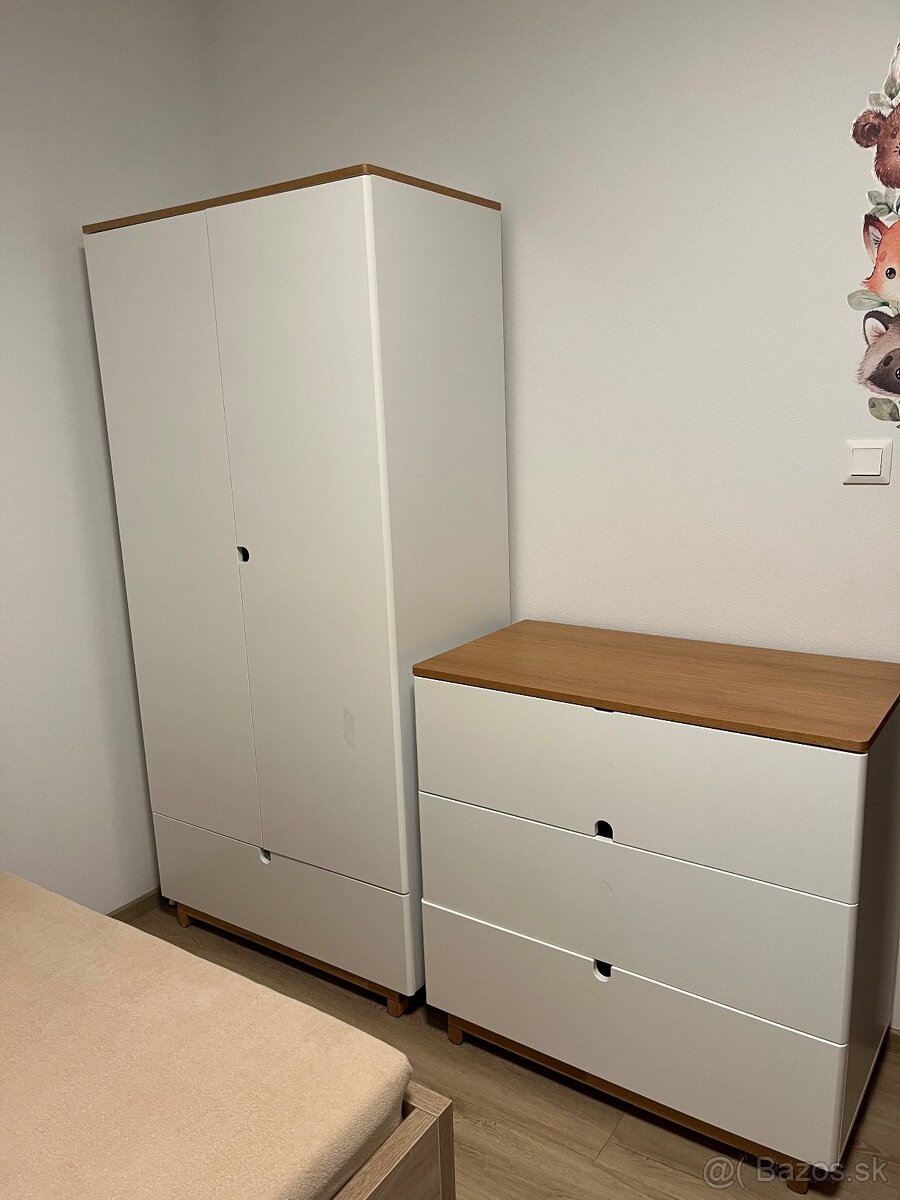 Predám veľmi zachovaný nábytok, kupovaný pred 2 rokmi, bol v detskej izbe, pôvodná cena 600€. Komoda ma na jednej strane nalepenú magnetickú tabuľu na magnety alebo pisanie so zotierateľnými fixami. Malé poškodenie je na veľkej skrini, viď foto. Zostali tam pozostatky z nálepky.