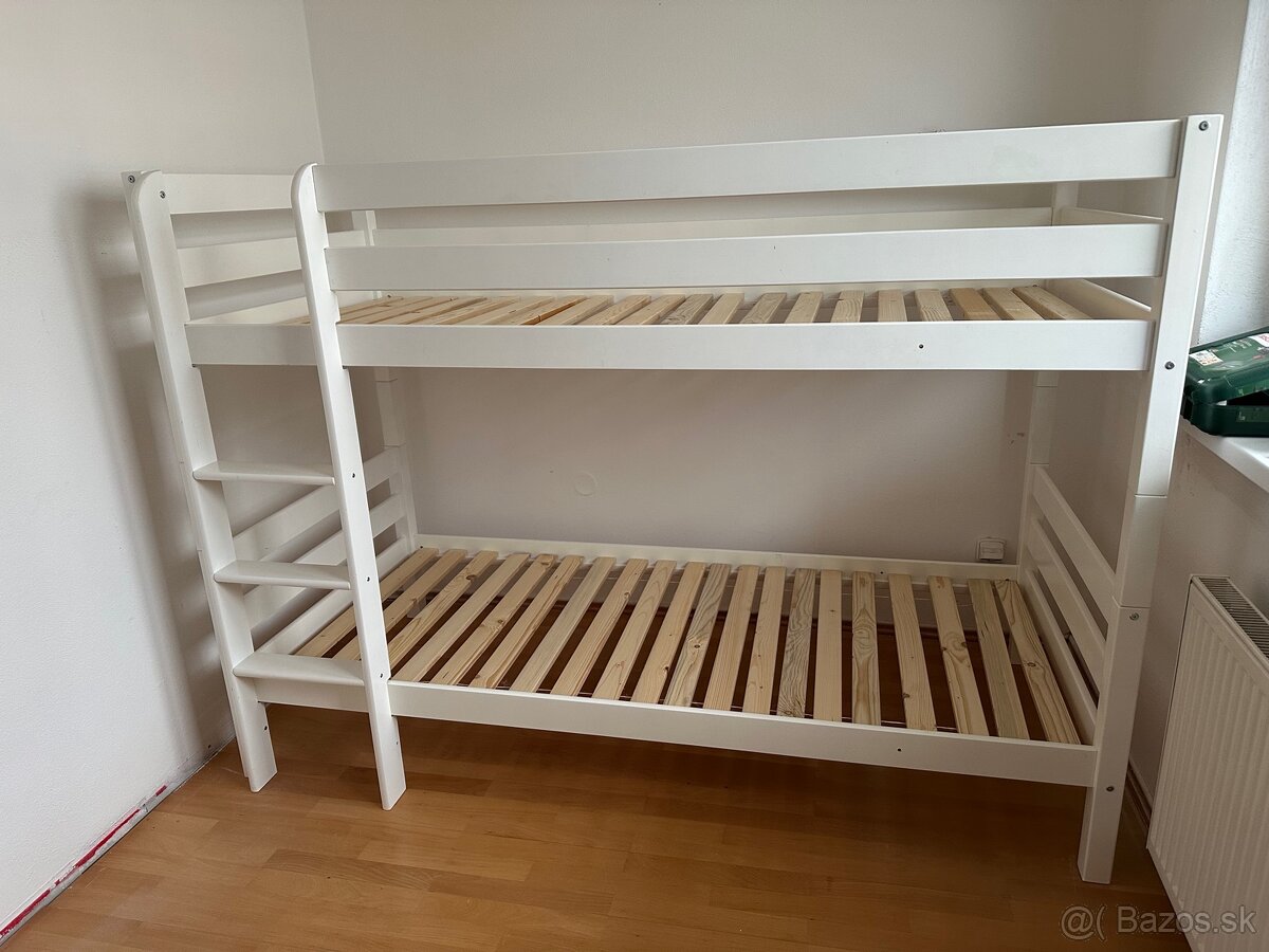 Predám poschodovu posteľ, s roštami, bez matracov, v dobrom stave. Rozmer na matrac 90x200. K dispozícii aj mini zábrana IKEA.