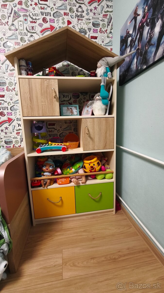 Predám detskú skrinku na hračky do detskej izby.Vyska- 1675, Šírka striešky-940, šírka korpusu-837, hĺbka striešky-450, hĺbka korpusu-400
