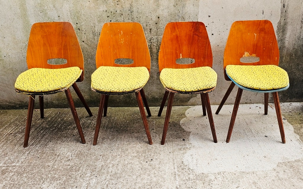 Retro stoličky František Jirák - "lízatká" - [26.1. 2026]Retro stoličky od dizajnéra Františka Jiráka vyrobené v závode Tatra Pravenec sú unikátnym kúskom z majstrovej dielne. Operadlá stoličiek sú vyrobené z ohýbanej bukovej/ orechovej dyhy s výraznou kresbou dreva. Dizajnér si dal záležať na ergonómii sedenia a stoličky sú vďaka ohýbaným operadlám veľmi ...