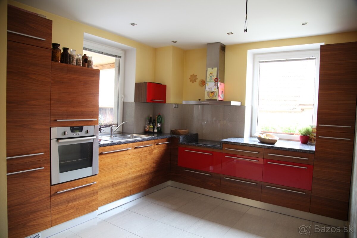 používaná vo veľmi dobrom stave, dvierka dýhované - orech. cena vrátane funkčnej vstavanej umývačky riadu elektrolux a funkčnej vstavanej chladničky s mrazničkou elektrolux. Kvalitné kovania, v červených šuflíkoch sa nachádzajú ešte vnútorné plytké šuflíky, pod rúrou je šuflík, v ktorom je tiež plytký vnútorný šuflík na plechy. Rozmery: ľavá strana cca298cm po stenu, pravá strana cca 278cm po stenu. Predaj možný aj s digestorom
