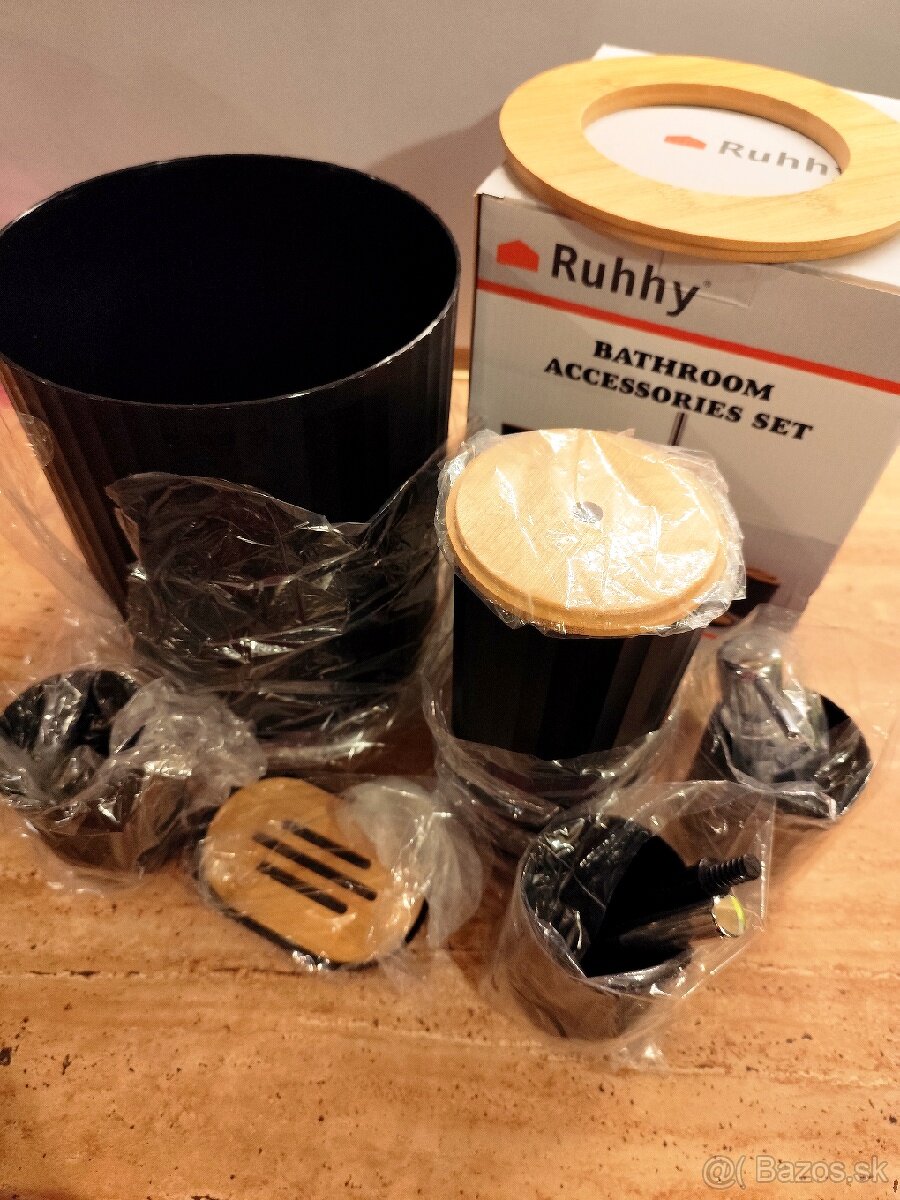 Kúpeľňový set – nový, čierny s dreveným dekorom.