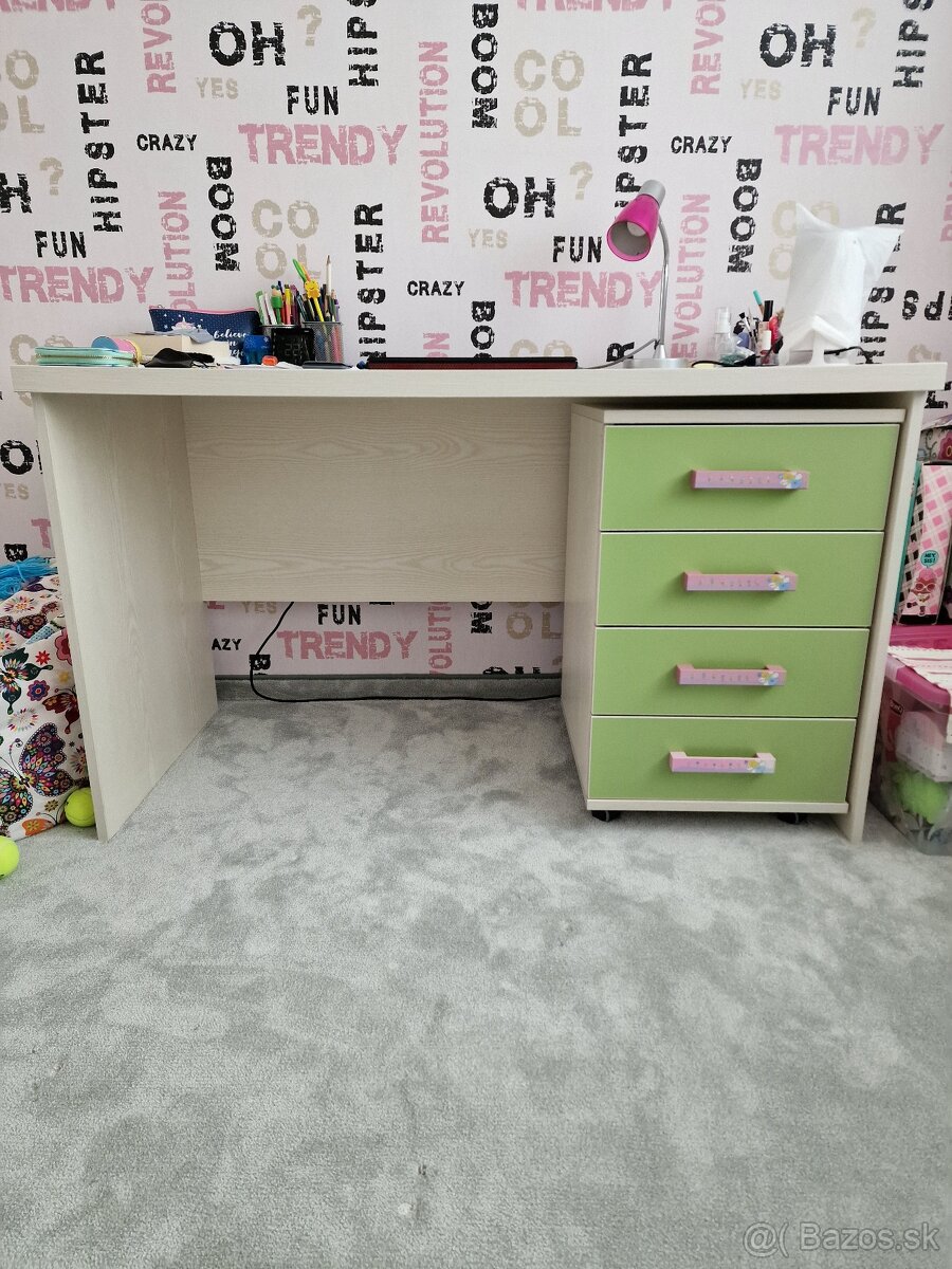 Ponúkam písací stolík po dcére z dôvodu sťahovania. Perfektný stav, vyrobený na mieru - stolárstvo Falat z BJ. Kontajner má kolieska, takže si môžete sami premiestňovať. Svetlé drevo s kresbou s hráškovo zelenými šuplíkami, uchytky pozri foto s krásnym dievčenským motívom víly.